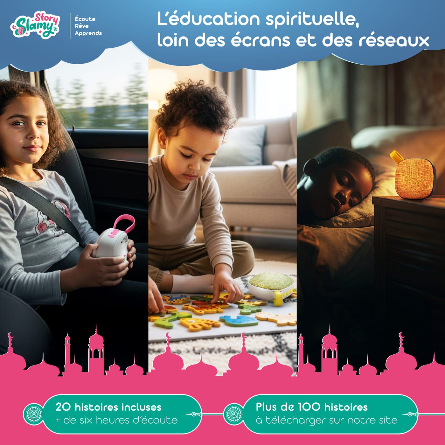 « Entre les cartes mémoire éducatives et les livres audio, mes enfants apprennent sans s’en rendre compte. J’aime beaucoup les valeurs véhiculées par Slamystory : imagination, douceur, bienveillance. »